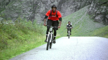 Teams must retrieve a set of mountain bikes and ride the path to the base of Mount Slogan for their next checkpoint.