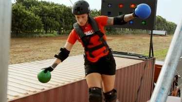 Teams will start on a tractor trailer next to an empty wall beside an additional tractor trailer. On TJ's signal, both trailers will start moving and once they reach 30 mph, the female player will jump from one trailer to the other to grab up to two balls and then return to the original trailer to deposit them. Once she has done this, the male player will then be allowed to go and they will repeat this process until their turn is over. Male players must remain on the outside of their partner so that their safety ropes do not tangle. The team to deposit the most balls in the fastest amount of time will win and nominate another team for the Dome. The team to deposit the least balls will go straight into the Dome.
